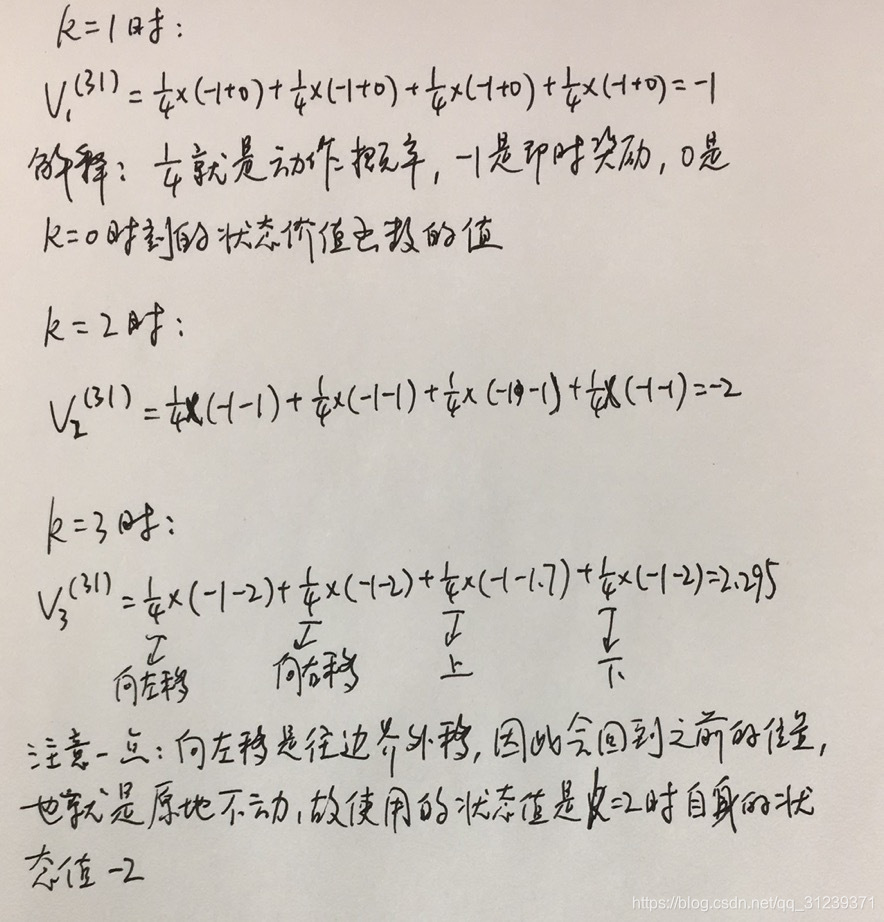 首先将所有格子的状态初始化为0,即图中k=0时的情况(策略评估部分关注的是上图中左侧的表格,即各个状态的价值函数)。由于终止格子的价值固定为0,我们可以不将其加入迭代过程。下面以第三行第一个格子为例,给出不同迭代轮次的计算过程: