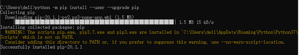 2、解决方法:使用 python -m pip install --user --upgrade pip 命令,更新pip成功