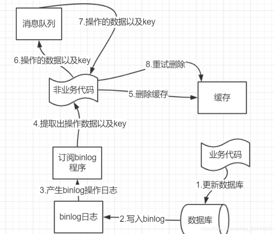 然而,该方案有一个缺点,对业务线代码造成大量的侵入。于是有了方案二,在方案二中,启动一个订阅程序去订阅数据库的binlog,获得需要操作的数据。在应用程序中,另起一段程序,获得这个订阅程序传来的信息,进行删除缓存操作。