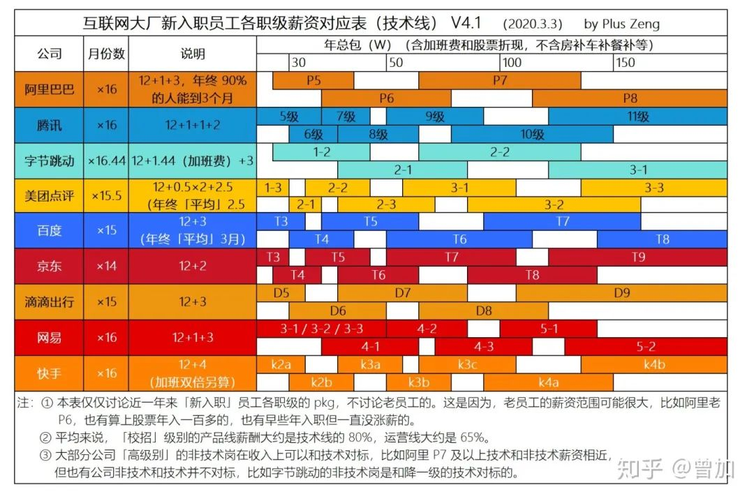 需要再次说明的是,这个是「技术线」「新入职员工」的职级和薪资情况,非技术线以及老员工的情况会和图中的范围有所出入。以校招生为例,产品线收入大概是技术线但 80%,运营线大约是收入大约是技术线但 65%。以及,更高级别的人(>P8)人数少,收入会相当依赖股票(超过一半),他们的收入范围很大,会比较难以量化,故没有列入。