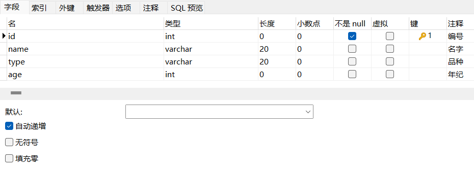 那么现在开始进行添加操作:先在数据库中新建一个dog表,然后向其中添加一条数据。