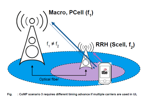 上图中的(a)中指出了不进行上行定时提前所造成的影响。从图中的(b)可以看出,TRP侧的上行子帧和下行子帧的timing是相同的,而UE侧的上行子帧和下行子帧的timing之间有偏移。同时可以看出:不同UE有各自不同的TA值,即TA值是UE级的配置。需要注意的是, 定时提前量是两倍的传输时间量。在有些地方中也被称为RTT(round trip time), 即往返时间。在没有TAG之前,上行载波聚合只能在所有载波的TA值相同时才可以进行。 中继在不同的频段内会引入不同的时延。另外一种典型场景是,为了拥有高吞吐量,一个宏小区(覆盖范围广的地方) 和一个其他频段的小小区(small cell)进行载波聚合。两个小区的天线位置不同,因此TA值差异较大,如下图所示。因此不同的载波需要用到不同的TA。