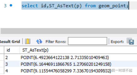 select id,ST_AsText(p) from geom_mpoint;ST_AsText函数可以将空间字段转换为WKT字符串。