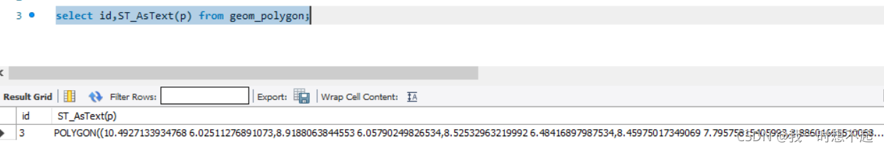 insert into 表名 (空间字段) values (ST_GeometryFromText(WKT字符串) );这里表示的是,向空间字段插入数据的SQL语句,一般来说,还伴随着其他非空间字段的属性一并插入,这里省略了。相信对于属性SQL的数据库同仁来说,很好理解。这里用到了ST_GeometryFromText这个函数,这个函数可以将WKT字符串转换为MySQL空间字段。