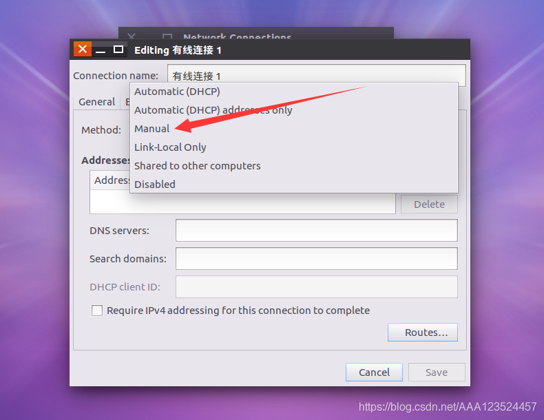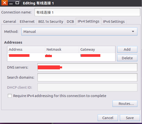 除了固定IP,其他的信息抄下来,填入对应的区域就可以了。然后保存退出,断开网络链接,然后再重新链接网络就生效了。