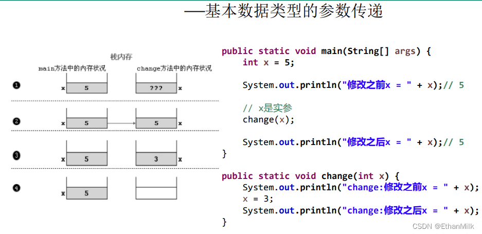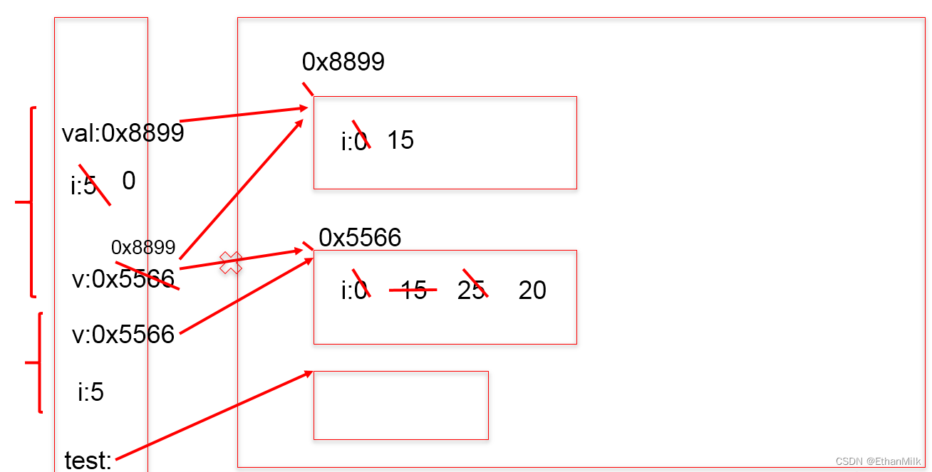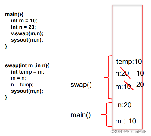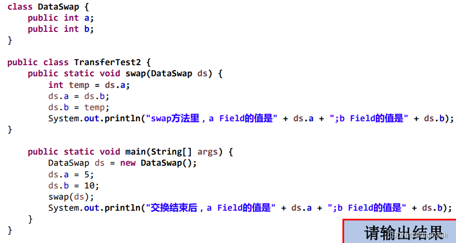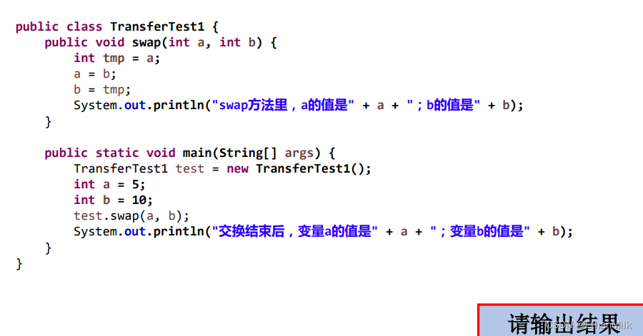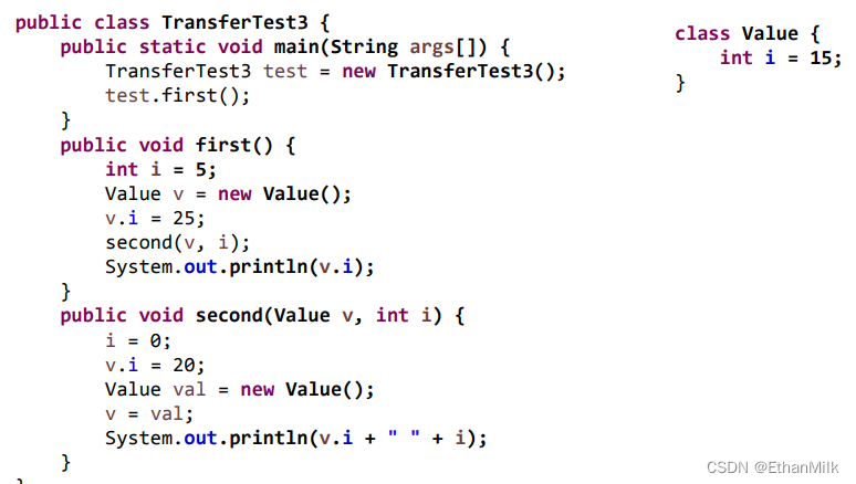 public static voidmain(String[]args) { Stringstr=newString("world"); char[]ch=new char[]{'h','e','l','l','o'}; change(str,ch); System.out.println(str); System.out.println(String.valueOf(ch)); } public static voidchange(Stringstr,char[]arr){ str="change"; arr[0] ='a'; arr[1] ='b'; arr[2] ='c'; arr[3] ='d'; arr[4] ='e'; } |