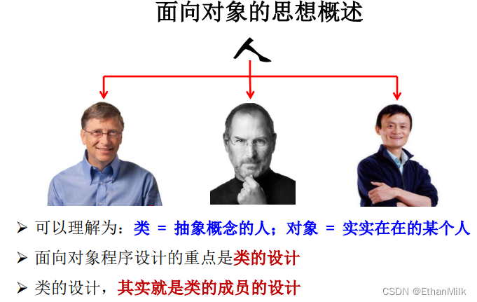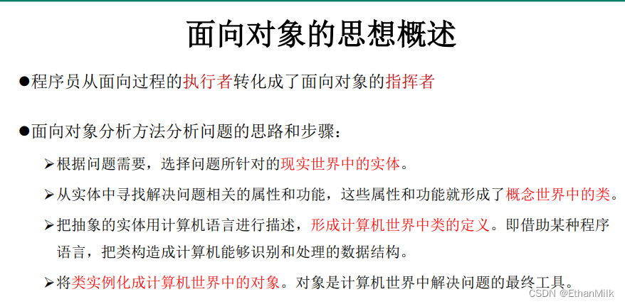 面向对象更加强调运用人类在日常的思维逻辑中采用的思想方法与原则,如 抽象、分类、继承、聚合、多态等。