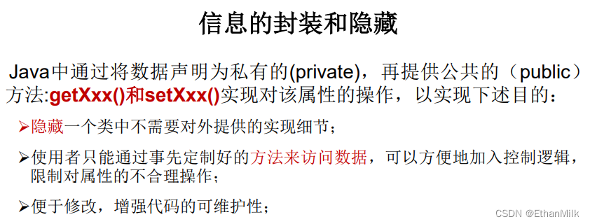 隐藏对象内部的复杂性,只对外公开简单的接口。便于外界调用,从而提 高系统的可扩展性、可维护性。通俗的说,把该隐藏的隐藏起来,该暴露 的暴露出来。这就是封装性的设计思想。