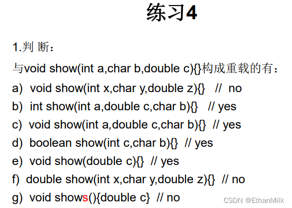 B,void show(int a,int b,float c){}//一模一样。不可以出现在同一个类中。