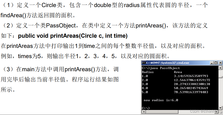 classCircle { private double radius; publicCircle(double r) { radius=r; } publicCircle compare(Circlecir){ //程序代码 /* * if(this.radius>cir.radius) return this; return cir; */ // return (this.radius>cir.radius)?this: cir; } } classTC { public static voidmain(String[]args) { Circlecir1=newCircle(1.0); Circlecir2=newCircle(2.0); Circlecir; cir=cir1.compare(cir2); if(cir1==cir) System.out.println("圆1的半径比较大"); else System.out.println("圆2的半径比较大"); } } |