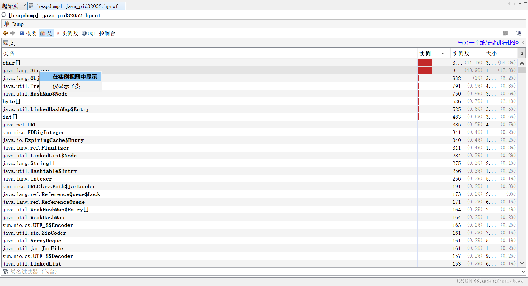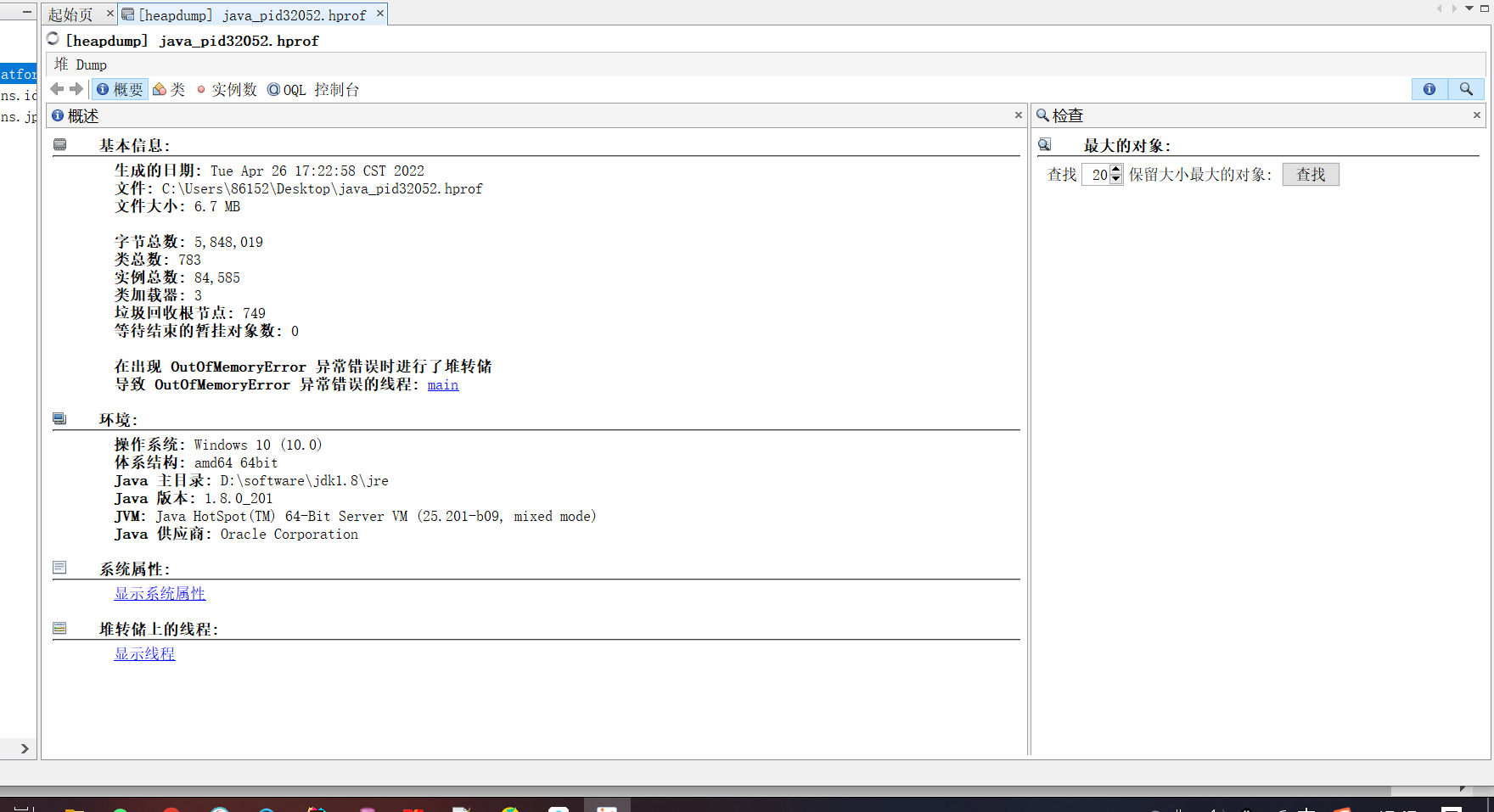 Process finished with exit code 1第四步使用jvisualvm工具打开java_pid32052.hprof文件