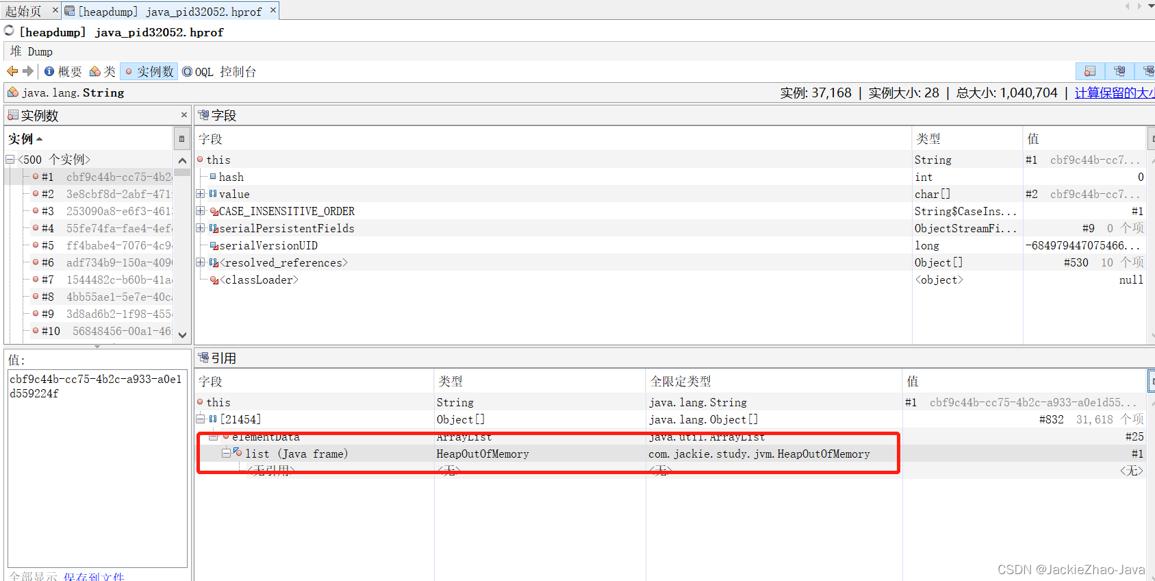 第六步点击在实例试图中显示,在引用中即可定位堆内存溢出位置