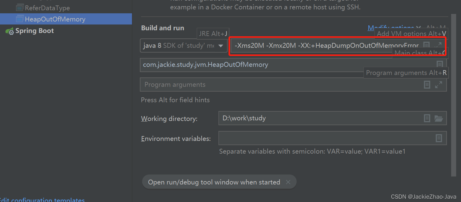 第一步设置虚拟机参数:-Xms20M -Xmx20M -XX:+HeapDumpOnOutOfMemoryError(当堆内存溢出是dump堆)