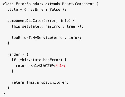 static getDerivedStateFromError(error) 允许开发者在 render 完成之前渲染 Fallback UI,该生命周期函数触发的条件是子组件抛出错误,getDerivedStateFromError 接收到这个错误参数后更新 state。