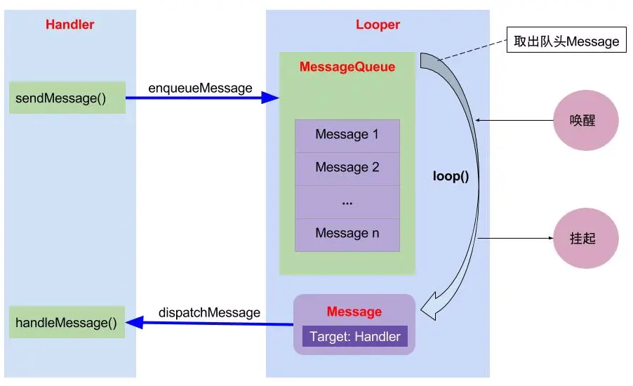 Message类型。 - MessageQueue:消息队列,用于存储消息。发送消息时,消息入队列,然后Looper会从这个