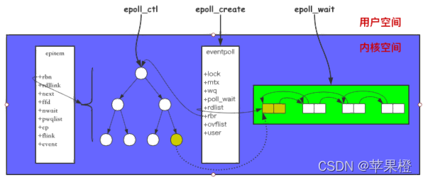 事件拷贝到 rdlist 双向链表中;调用 epoll_wait 将会把 rdlist 中就绪事件拷贝到用户态