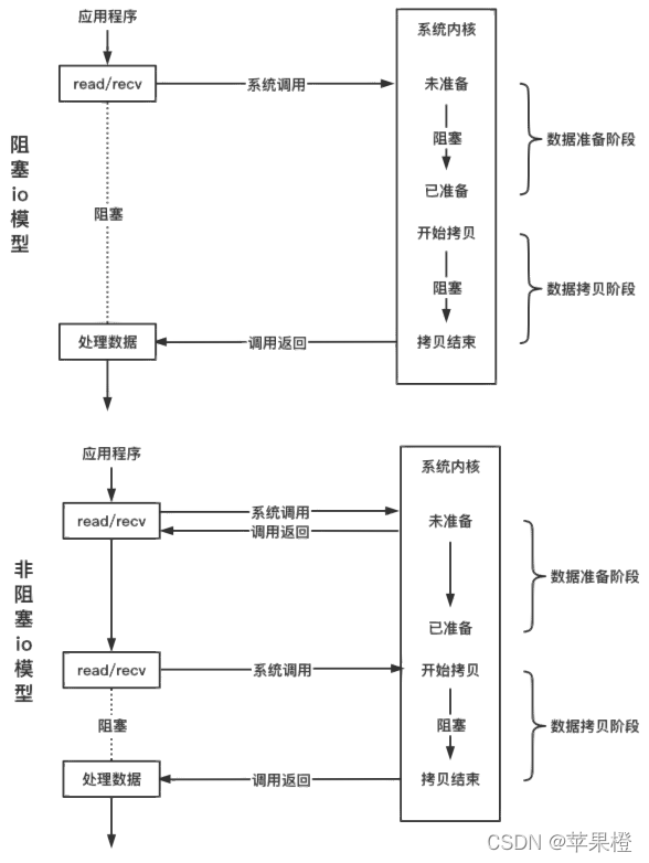 流程可以分为连接的建立,消息的到达,消息发送完毕,连接的断开 。之前讲的fd的阻塞与非阻塞属性是可以进行设置的,但是非阻塞其实也只是在数据准备阶段为非阻塞,如下图: