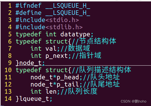 这样定义结构体,这样我就有了节点结构体和队列描述结构体,用节点结构体去创建新的节点入队,用队列描述结构体定位队头队尾位置以及长度