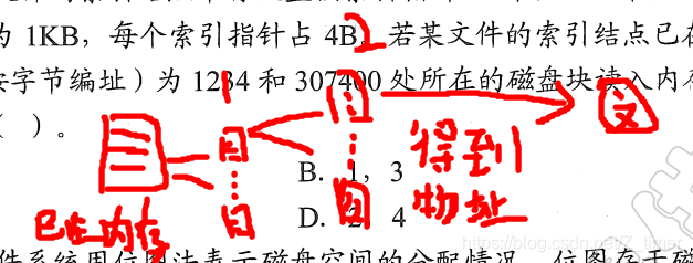 题3:【2015统考真题】在文件的索引结点中存放直接索引指针10个,一级和二级索引指针各1个。磁盘块大小为 1KB,每个索引指针占4B。若某文件的索引结点已在内存中,则把该文件偏移量(按字节编址)为1234和307400处所在的磁盘块读入内存,需访问的磁盘块个数分别是( )。