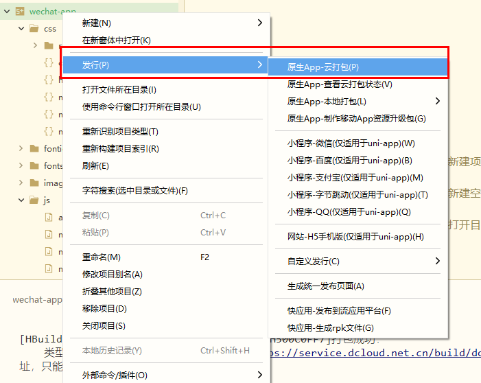 以上配置完后就可以开始打包啦,HBuilderX中项目右键 发行->原生App-云打包