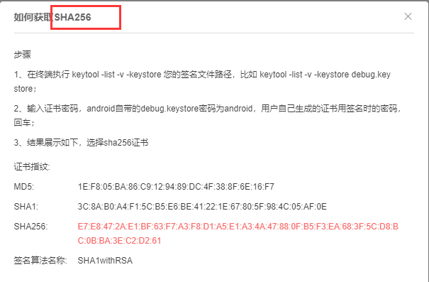 该对话框中大概说明了获取步骤,而且注意指明的是SHA256的签名哦,接下来我会说明在本机怎么获取SHA256签名。