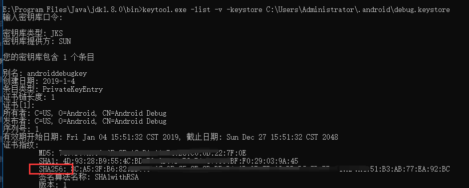 keytool.exe -list -v -keystore C:\Users\Administrator\.android\debug.keystore
