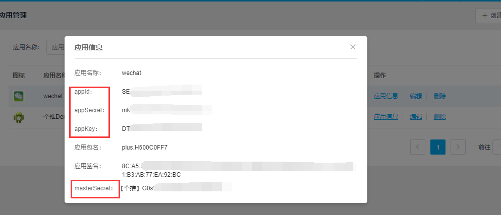 配置个推相关信息,注意appid,appkey,appsecret均来自我们在之前创建的应用当中,复制过来即可。