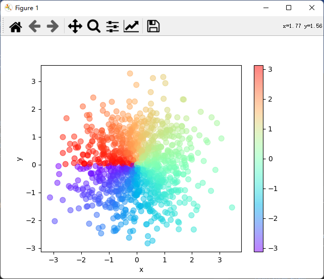 df.plot.scatter(x="x", y="y", c=color, s=60, alpha=.5, cmap="rainbow")我们需要导入matplotlib包,然后在代码最后加上plt.show()即可。像这样: