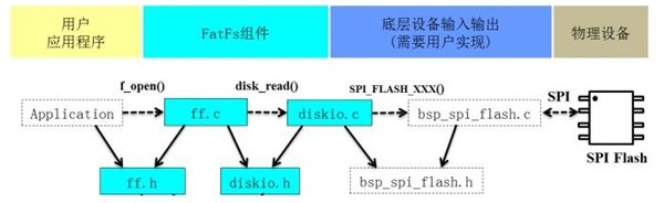 FatFs 程序结构如下图,用户应用程序需要由用户编写,想实现什么功能就编写什么的程序,一般我们只用到 f_mount()、 f_open()、f_write()、 f_read()就可以实现文件的读写操作。底层设备可以是 SD 卡/ATA/USB/NAND/RTC 等。