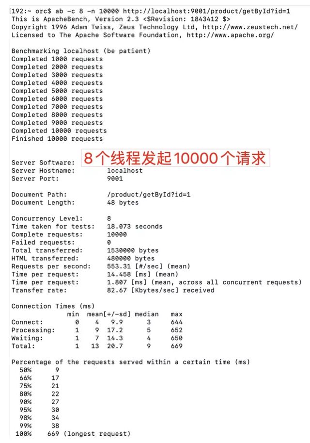 在本人MacBook Pro 13寸,4核I5,16g内存,使用Nacos注册中心,启动一个服务器,一个客户端情况下,采用轮询负载均衡策略的情况下,使用Apache ab测试。