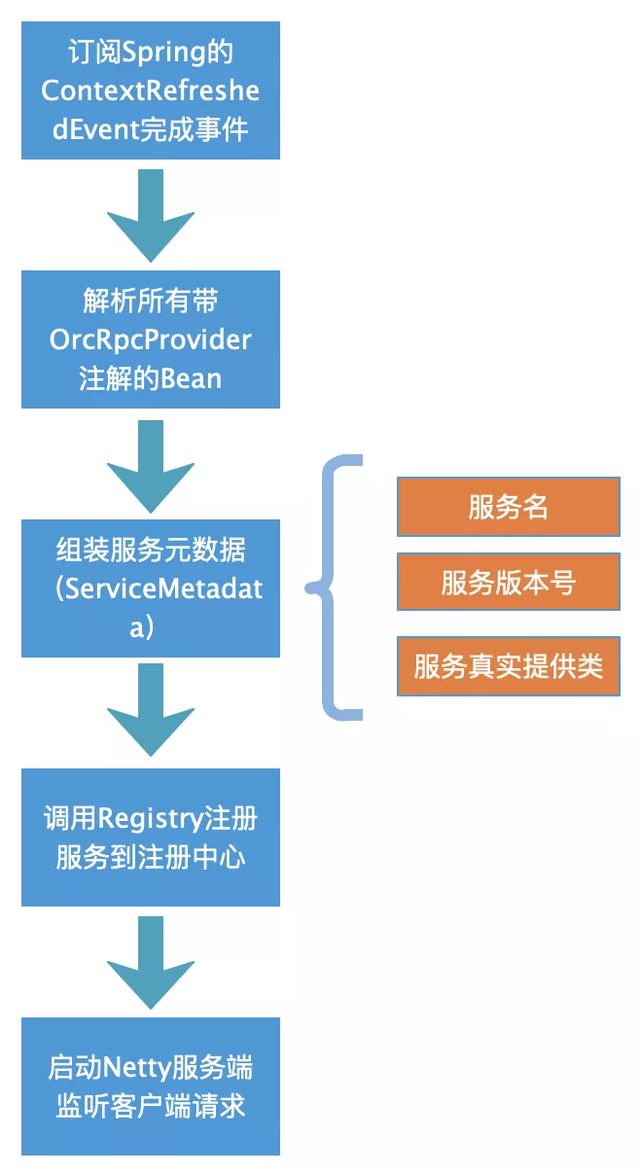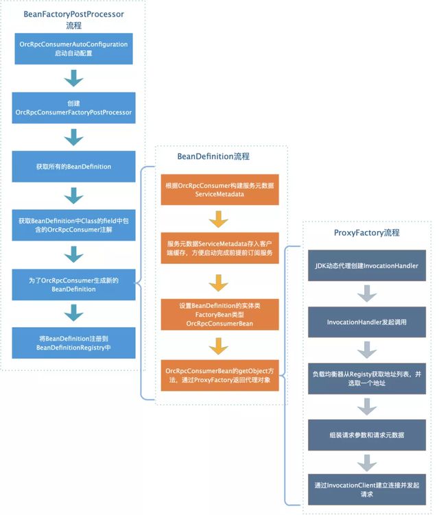 - 一是在应用的Spring Context初始化完成事件时触发,扫描所有的Bean,将Bean中带有OrcRpcConsumer注解的field获取到,然后创建field类型的代理对象,创建完成后,将代理对象set给此field。后续就通过该代理对象创建服务端连接,并发起调用。