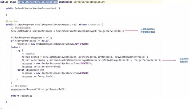 服务请求响应模块也比较简单,是根据请求中的服务名,从缓存中获取服务元数据,然后从请求中获取调用的方法和参数类型信息,反射获取调用方法信息。然后从spring context中获取bean进行反射调用。