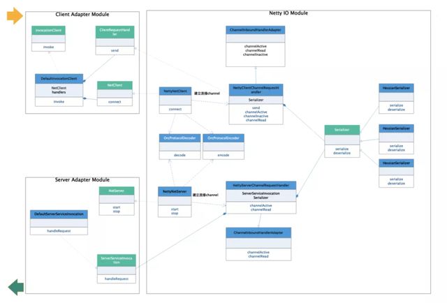结构比较清晰,分三大模块:客户端调用适配模块、服务端请求响应适配模块和Netty IO服务模块。