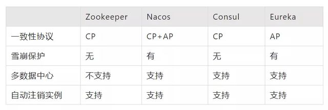 目前成熟的注册中心有Zookeeper,Nacos,Consul,Eureka,它们的主要比较如下: