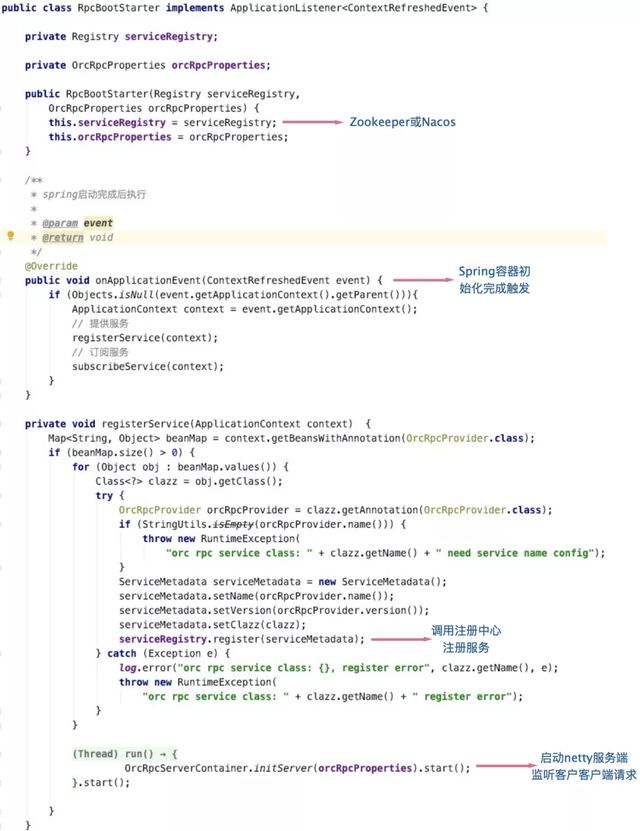 在自动配置类OrcRpcAutoConfiguration完成注册中心和RPC启动类(RpcBootStarter)的初始化: