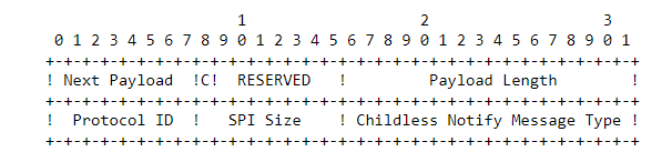 o Childless Notify Message Type (2 octets) - 必须是 16418,分配给 CHILDESS_IKEV2_SUPPORTED 的值。