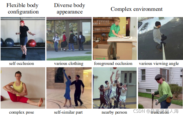 - 复杂的环境可能会造成前景遮挡,靠近的人体相似或遮挡,视角多样,图片中存在的截断问题。