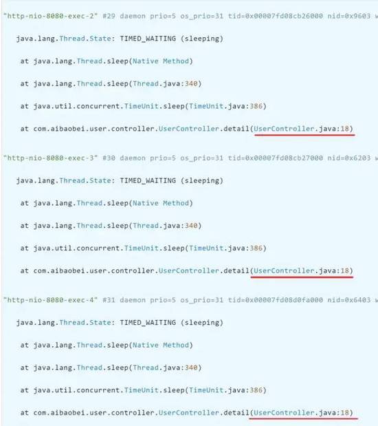 从上面的日志可以看你出,这里有多个线程都阻塞在了UserController的第18行,说明这是一个阻塞点,也就是导致该接口比较缓慢的原因。