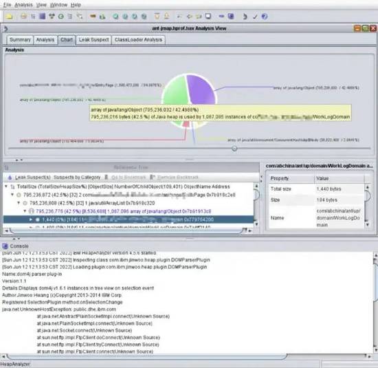通过ha457.jar的GUI界面可以很清晰的看到各种类型的数据内存占用情况、对象之间的引用关系以及可能存在内存泄漏的对象。