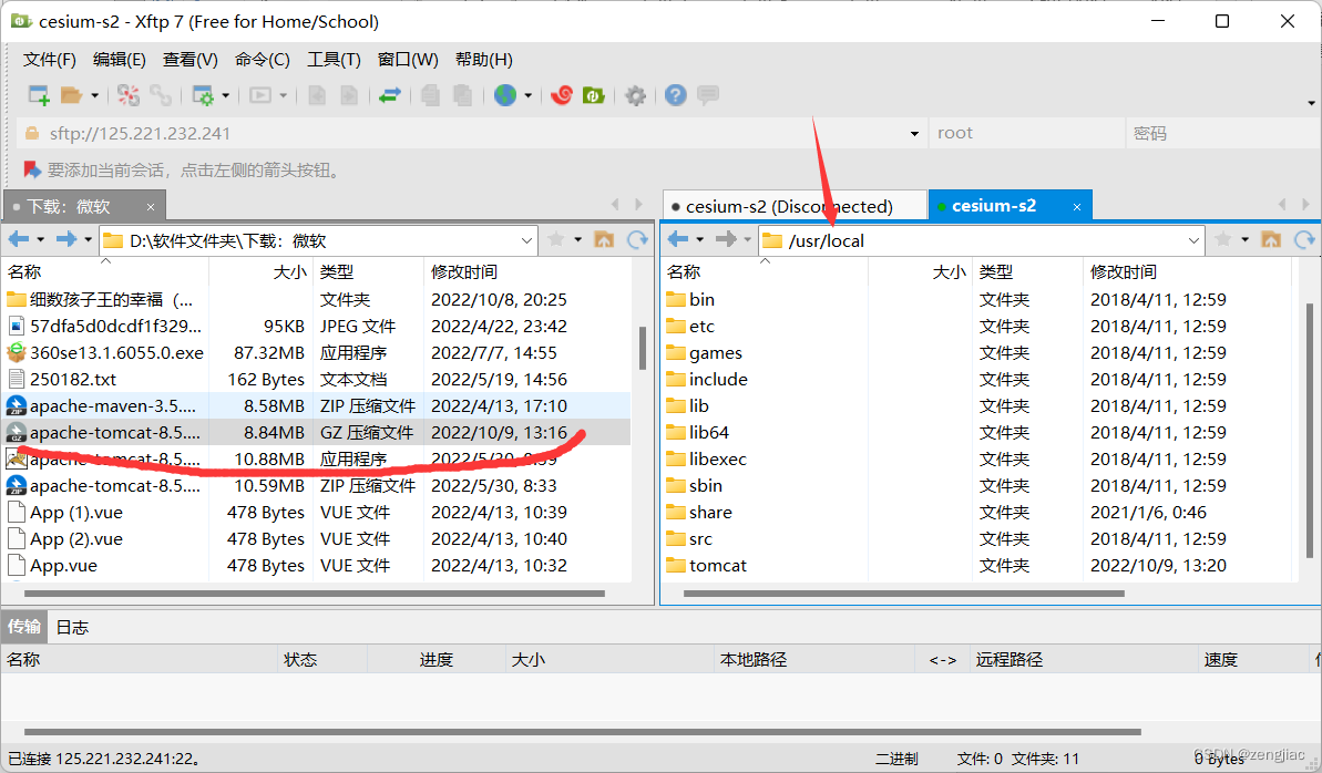 将下载好的apache-tomcat-8.5.4.tar.gz 文件传到/usr/local文件下。