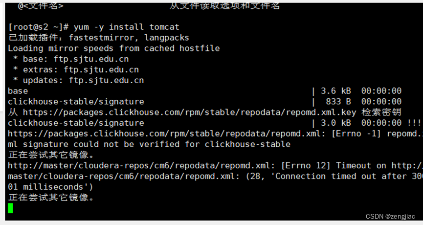 原本可以使用yum -y install tomcat直接安装很难下载需要的资源:在我的服务器上经常会显示尝试其他镜像,处理方法是