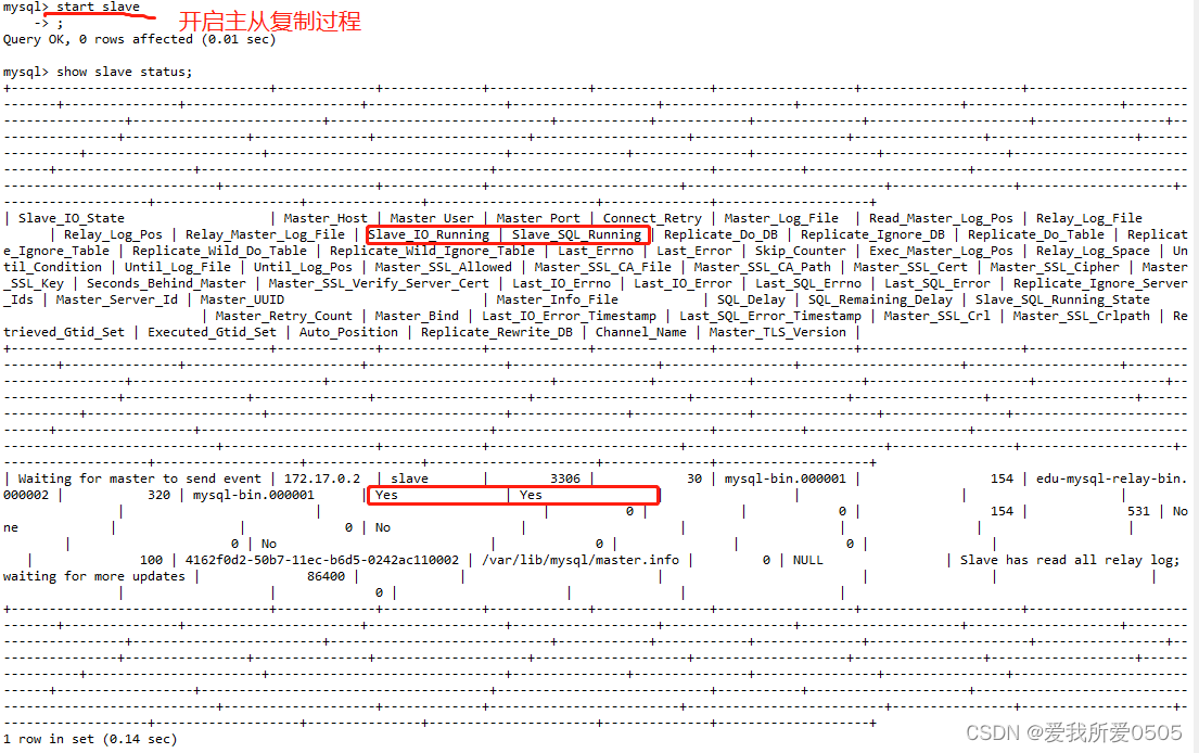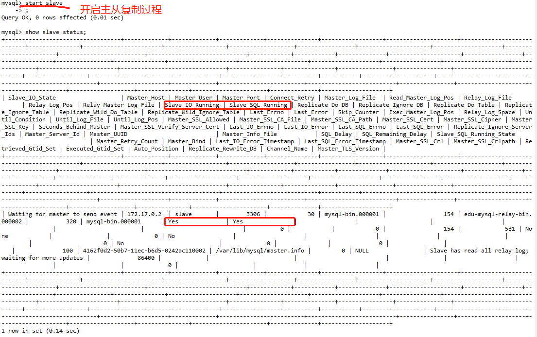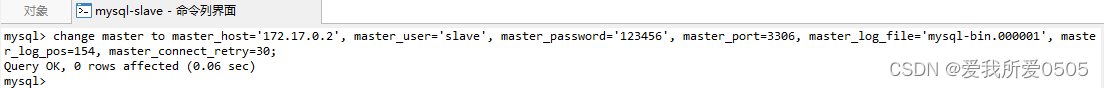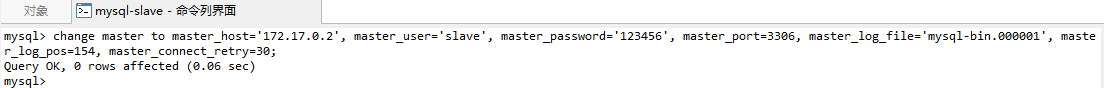 change master to master_host='172.17.0.2', master_user='slave', master_password='123456', master_port=3306, master_log_file='mysql-bin.000001', master_log_pos=154, master_connect_retry=30;配置参数: