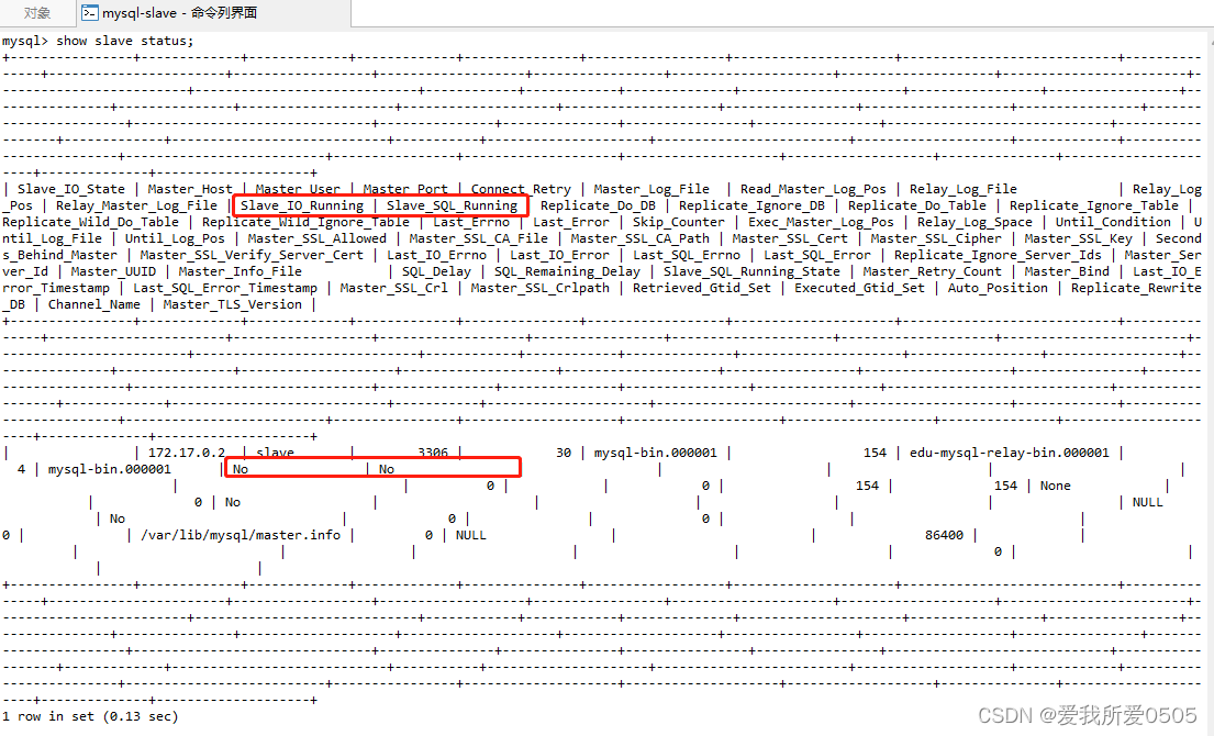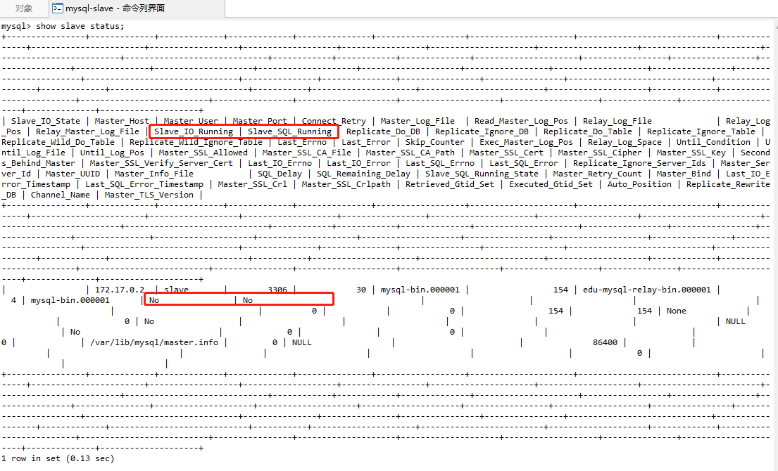 注意:Slave_IO_Running、Slave_SQL_Running都是No,说明没有开启主从复制过程。