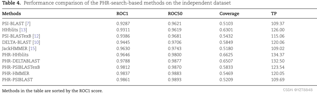 为了评估PHR-search框架的性能,使用了SCOPe2.06基准数据集上的五重交叉验证和SCOPe2.07独立数据集上的独立测试[39–41]。因为基于PHR的相似性特征和由学习和排序模型[35]重新排序的结果是从5重交叉验证的预测结果中获得的,所以训练和测试过程是完全独立的[25]。结果和讨论PHR-search框架提高了五种基本搜索方法的性能为了探索用于蛋白质远程检测的PHRsearch框架的性能提高,将该框架应用于五种重要的搜索方法,包括HHblits [14]、JackHMMER [16]、PSI-BLAST [7]、DELTA-BLAST [11]和PSI-BLASTexB [13]。此外,为了证明PHRsearch框架的优势,将其与三个相关框架进行了比较,包括PL-search [10]、SMI-BLAST [24]和S2L-PSIBLAST [25]。将PHR-search框架应用于这些基本搜索方法后,它们的性能在ROC1方面提高了3–7 %(表1)。在基于PHR的方法中,PHR-HHblits在排序质量和检测到的同源蛋白数量方面获得了最好的性能。这意味着更好的基本方法导致更高的PHR搜索性能。对于PSI-BLAST的两个改进版本(DELTA-BLAST和PSI-BLASTexB),它们的性能通过PHR-search框架得到了进一步的改进。这意味着PHRsearch框架和这两个改进版本是互补的。与基于PL的方法、基于SMI的方法和基于S2L的方法相比,PHR-search框架具有更好的性能和通用性。从图4和表1可以看出:1)除了SMI-BLAST框架和S2L-PSIBLAST框架改进的四个基本方法外,PHRsearch框架也被应用于HHblits,并取得了最好的性能;2)与S2LDELTABLAST相比,PHR-DELTABLAST在ROC1方面的性能进一步提高了2%