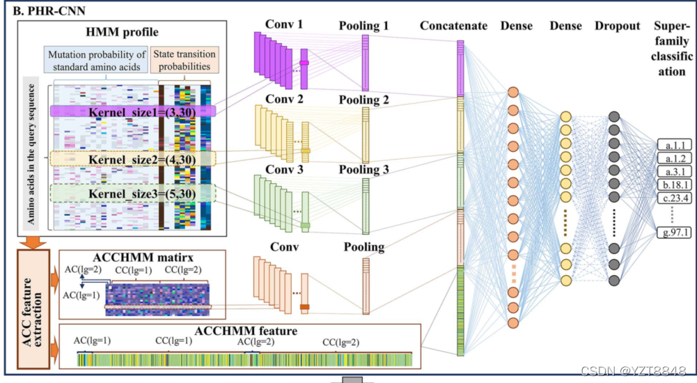 在本节中,构建了一个卷积神经网络,用于捕获HMM简档的局部到全局信息,称为PHRCNN(图3B)。PHR-CNN有三个输入:具有状态转移概率的HMM矩阵、HMM的ACC特征矩阵HMM简档的ACC特征向量。对于具有状态转移概率的HMM矩阵,使用TextCNN来捕获蛋白质序列的氨基酸之间的局部特征。与普通卷积神经网络相比,TextCNN使用了三种不同的卷积核来增强捕捉HMM矩阵局部信息的能力。根据参数LG为2的ACC特征提取算法的窗口大小,将三类卷积核的大小分别设置为k1 : [3,30]、k2 : [4,30]和k3 : [5,30]。在通过卷积核提取HMM矩阵的局部信息之后,局部特征可以表示为[30]: