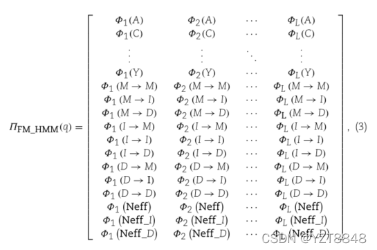 第三种表示是包含氨基酸突变概率和状态转移概率的HMM矩阵,它也是由HHblits构造的。该HMM矩阵可以表示为: