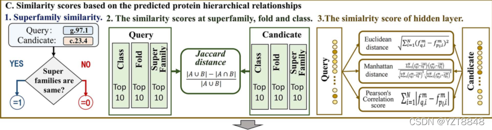 在该部分中,基于基于PHR的特征(基于PHR的相似性得分),使用三种类型的相似性计算方法来计算七个相似性特征。第一类相似度计算方法是通过PHRCNN的预测结果来判断蛋白质序列对是否属于同一个超家族。