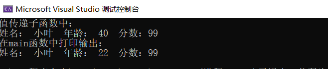 stu.age = 40; //在值传递中,修改形参,实参不会改变