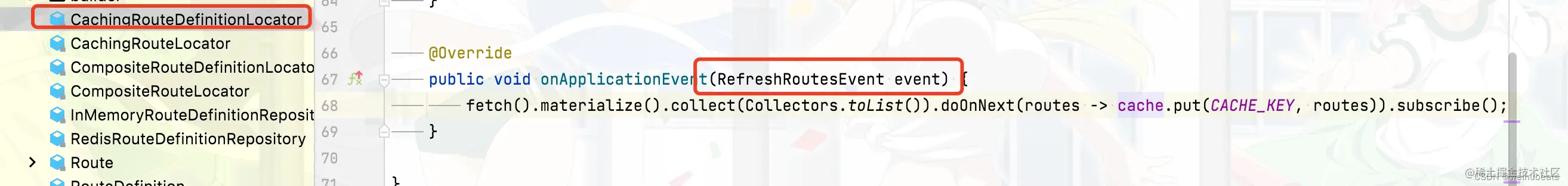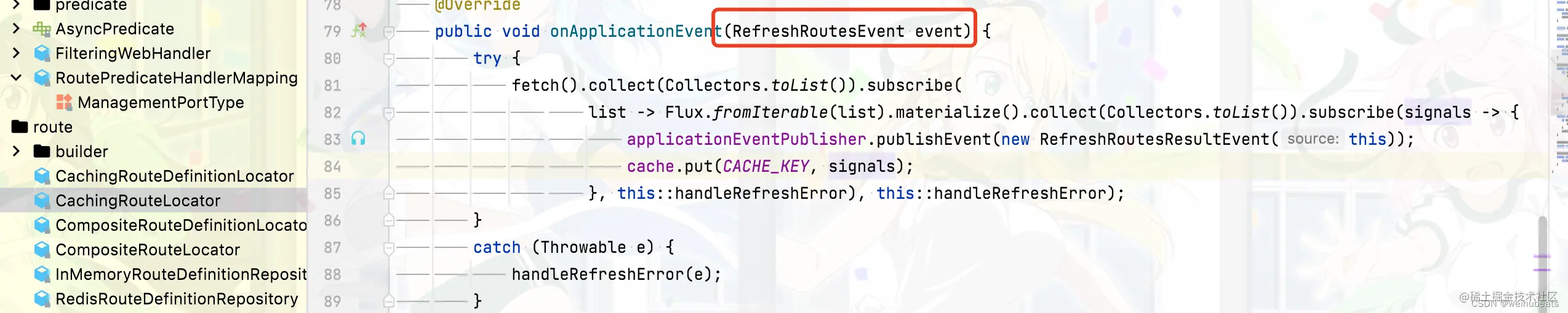 所以看到这里我们知道我们还需要解决的一个问题就是更新缓存,如何刷新缓存呢,这里Spring Cloud Gateway利用spring的事件机制给我提供了扩展