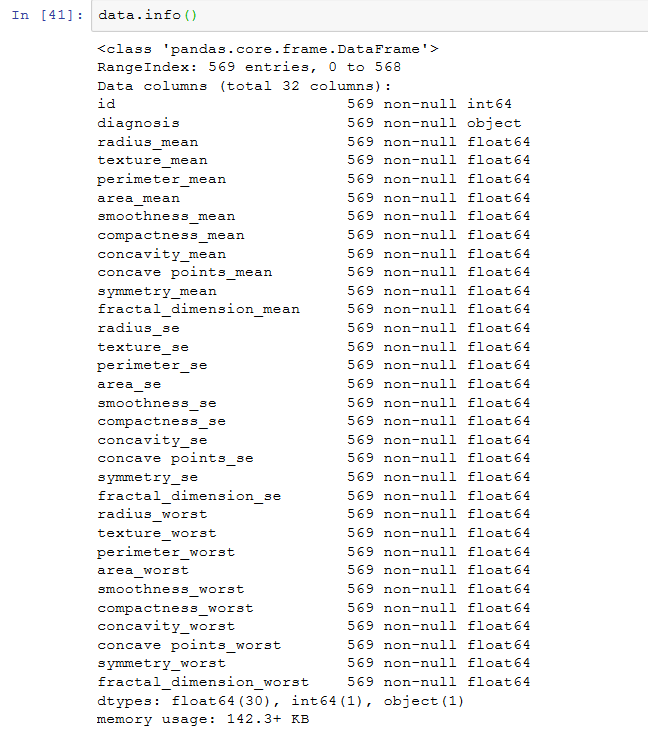 mean 代表平均值,se 代表标准差,worst 代表最大值,后30个特征值实际是10个特征值(radius、texture、perimeter、area、smoothness、compactness、concavity、concave points、symmetry和fractal_dimension_mean)的平均值、标准差和最大值。